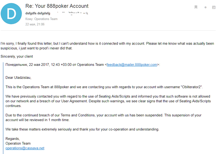 20 декабря 2016 года я получил письмо от Операционного отдела о том, что я якобы использую скрипты автопосадки (если мне не изменяет память, в то время я играл нл5 или 10 – СКРИПТЫ! на нл 5-10, Карл!). К сожалению, это письмо своевременно я не заметил, и обнаружил его лишь когда произошла первая блокировка моего аккаунта, вместе с которой пришло письмо, мол, мы вас уже предупреждали, и раз вы продолжаете использовать скрипты, аккаунт заблокирован и проверка может занять один месяц. К слову, это второе письмо пришло через почти полгода (22 мая 2017), что наводит меня на варианты: а) это какая-то заранее запланированная процедура в отношении меня; б) служба безопасности по доброте своей полгода позволяла мне нещадно пользоваться скриптами; в) я предусмотрительно перестал ими пользоваться, но через полгода (как только все утихло?), продолжил ими пользоваться. Я тут же ответил, что не виноват, и аккаунт разблокировали уже через сутки.