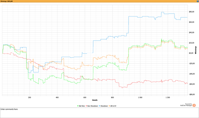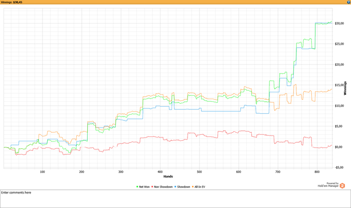 Сейчас БР чуть больше 400$, НЛ10 добиваю, на 600 выхожу на НЛ20, думаю, что до конца месяца реально. EV/bb100 на НЛ10 9.4, но объективно игра улучшается и я ожидаю не меньше 10 на дистанции 40-60к рук. Покердоп говорит, что в 70% случаев интервал будет от 4бб/100 до 16бб/100, будем надеяться, что ГСЧ раздаст на 16