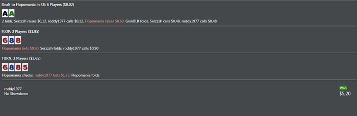 Если флоп мы сыграли 50/50... то терн запороли... В твоем случае я бы сыграла чек ривер и кол ставки вплоть до 75% от оппонента. На ставку более 75% - скорее всего тут бы фолдила.