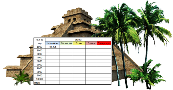 Свою игру разобью на 5 этапов: 1) Картахена (Cartagena)- Buy –in 0,25$ (10,000 турниров или + 100$); 2) Согамосо ( Sogamoso) -Buy –in 1$ (10,000 турниров или + 300$); 3) Тунха (Tunja) - Buy –in 3$ (10,000 турниров или + 700$); 4) Богота (Bogota) - Buy –in 7$ (10,000 турниров или + 1500$); 5) Эльдорадо (EL Dorado) Buy –in 15$ (10,000 турниров ).