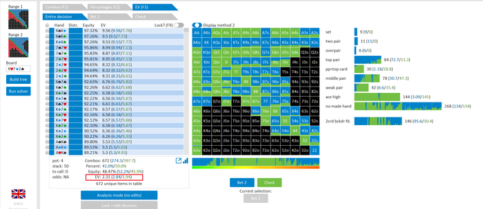 Нихера не разобрался. Почему такая гигантская разница по ЕВ бета и чека не пойму. Разница с симплом очень приличная. GTO+ какой-то более линейный диапазон бета строит, плохо защищая чек. Забивал разные упрощенные раздачи, но нет разница огромная. Смотрел официальное видео с расчетом раздачи, там такая же херь, разница 2-ух действий большая очень. Может я чего не понимаю, может так и должно быть? Короче, либо лыжи не едут, либо я еб...нутый :)