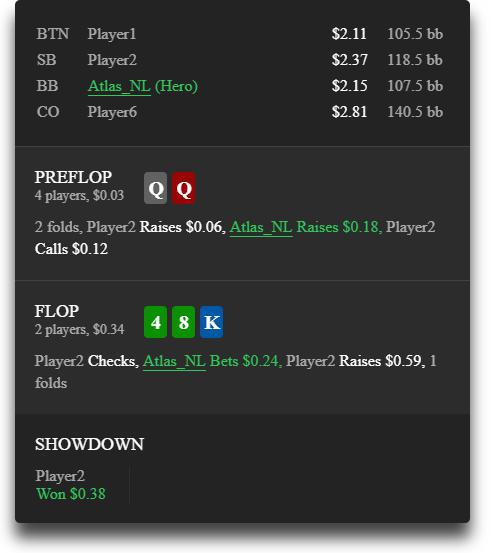Atlas_NL_ @ 9.2.2018 Уважаемые друзья! Хотел бы поговорить о тех моментах, когда имея на руках более-менее нормальную руку (я не имею ввиду руку из примера), и когда на флопе подъезжает хорошая комбинация вроде сета и выше. Как я заметил, люди имея сильные руки, ставят не слишком то много, дабы не спугнуть оппонента, дав ему понять что у тебя отличная рука. Я могу и ошибаться, но считаю что может так совпасть что и у оппонента будет рука с которой он готов ставить или коллировать много. Вопрос заключается в следующем, как вы себя ведёте когда у вас подкатывает сильная комбинация. Как наиболее эффективно вытрясти у оппонента как можно больше денег чтобы не спугнуть его? Примером на картинке показано как я реагировал когда у меня приехал сет. Прошу высказать ваше мнение логичными были эти ставки или нет, можно было больше ставить или нужно было ставить меньше.