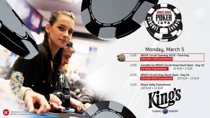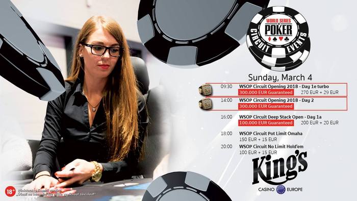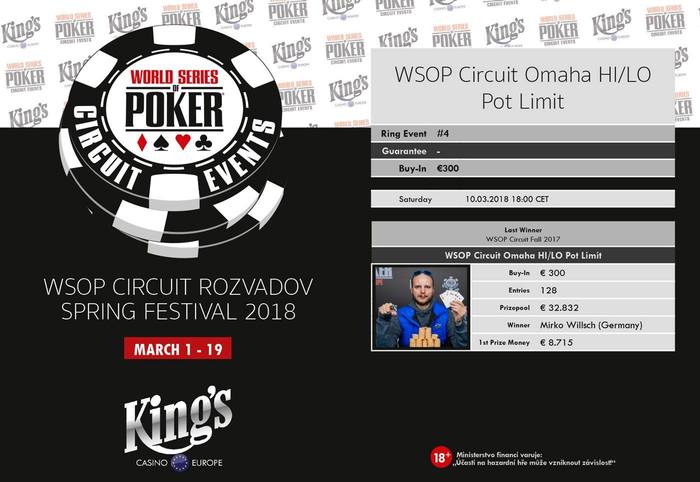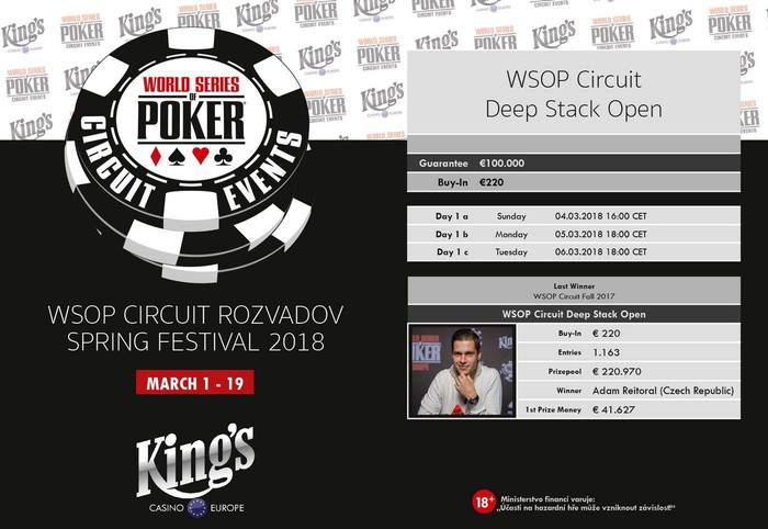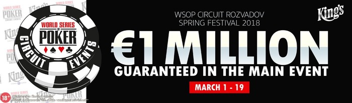 После двух успешных турниров WSOP в 2017 году - WSOP Circuit Festivals и премьеры WSOP Europe, в этом году запланировано еще больше турниров мировой серии по покеру в King`s Casino Rozvadov. Первый фестиваль - WSOP Circuit Spring Edition. 19-дневная серия, пройдет с 1 по 19 марта и будет включать в себя 14 событий победители которых получат перстни WSOP. Ожидаемый призовой фонд серии более 2 000 000 евро. Главным событием фестиваля станет турнир по NLH с баином 1 650 евро и гарантией 1 000 000 евро. Впервые partypoker будет официальным партнером фестиваля и проведет серию сателлитов.