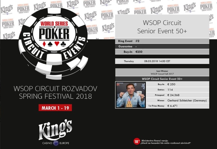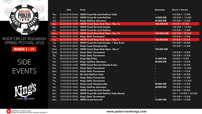 После двух успешных турниров WSOP в 2017 году - WSOP Circuit Festivals и премьеры WSOP Europe, в этом году запланировано еще больше турниров мировой серии по покеру в King`s Casino Rozvadov. Первый фестиваль - WSOP Circuit Spring Edition. 19-дневная серия, пройдет с 1 по 19 марта и будет включать в себя 14 событий победители которых получат перстни WSOP.