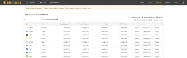 А как же найти мой адрес ETH? Обычно адрес кошелька и прочая информация находятся во вкладках Wallet или Funds. В случае с Binance, это Funds => Deposits Withdraws (депозиты и выводы) в левом вернем углу: