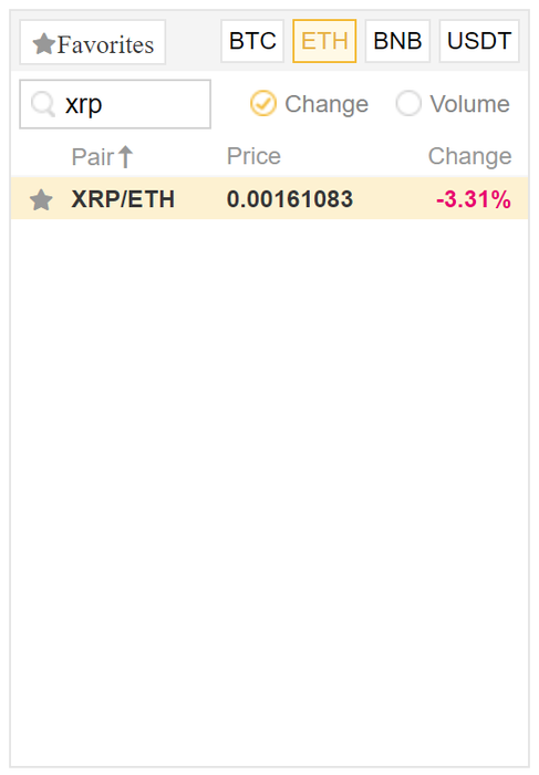 Оказавшись на бирже, начинайте просматривать монеты для торговли в правой панели. Если вы кликните ETH, а затем вобьете XRP (тикер Ripple), то сразу же увидите пару XRP/ETH. Нажмите на нее, с биржи загрузятся данные, и вы можете торговать.