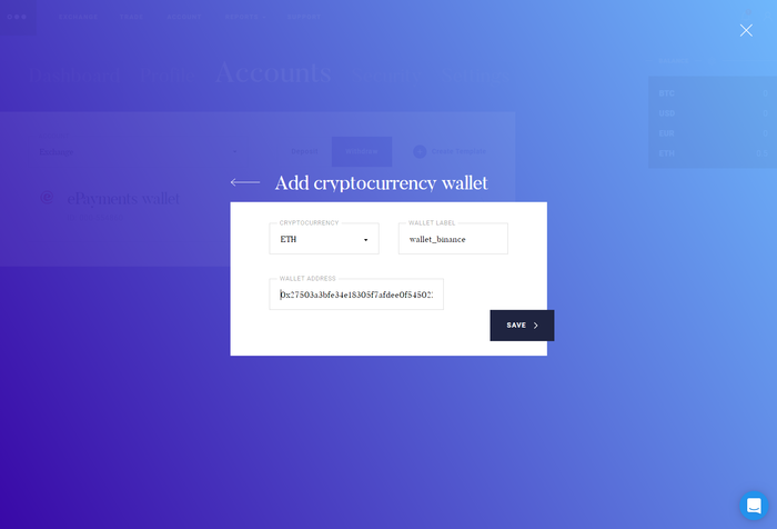 Как только появится окошко Add cryptocurrency wallet (добавить криптовалютный кошелёк), я выбираю ETH и прописываю ETH Address (или адрес BTC/LTC/XRP в зависимости от того, что вы выводите). А что такое ETH Address (адрес ETH)? Не углубляясь в детали блокчейна, скажу лишь, что это мой идентификатор. У меня разные адреса ETH для каждой биржи (равно, как и разные адреса для каждой криптовалюты). Кроме того, я сам могу сгенерировать адрес (здесь я не буду касаться этой темы). После того, как я передаю DSX мой Binance ETH address, DSX сможет посылать мой Ethereum в нужное место и, таким образом, я могу начинать торговать на Binance.