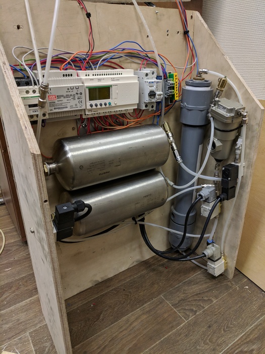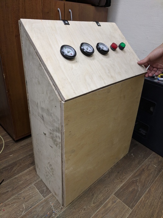 Моя компания делает большие промышленные установки (с высотой от 3-4 метров до 20 метров (как пятиэтажный дом). Но недавно в нашу группу поступила задача о том, что теперь нам еще надо разработать маленький генератор по получению азота для Старбакса. Для начала нужно было сделать прототип "на коленке" с определенными габаритами. Мы с напарником вырезали из фанеры корпус, наполнили его всеми комплектующими и сами собрали всю электрику. Вот что получилось (естественно, что потом сделают нормальный металлический корпус и всё приведут в порядок):