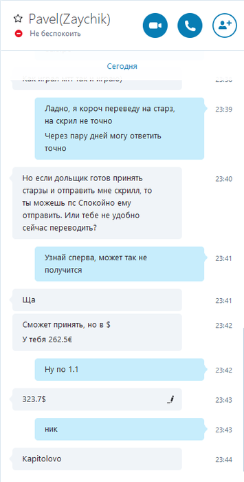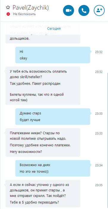 Давайте я факты только напишу, а выводы каждый сделает сам. - Я продаю доли на офлайн турнир. - Несколько дольщиков почти одновременно написали, что с ними по скайпу или вконтакте связался мошенник, который представился мной или другим дольщиком. Его скайп Pavel(Zaychik) ко мне никакого отношения не имеет, страницы вконтакте тоже - После небольшого разговора фейк просит перевести долю на скрилл/нетеллер или на ник kapitolovo на старзах - Скрины со скайпа в первом посте мне отправил дольщик - Кто такой этот капитолово я не знаю. Если мошенник просит перевести деньги на этот ник, с большой вероятностью этот ник имеет к нему отношение.