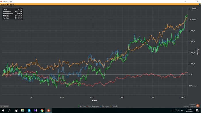 на моем графике тоже видно. Что фактически выграно меньше чем линия алын ев, что говорит о том, что перезжают. Для данной дисциплины это норм. У тебя совсем нету дистанции, поэтому не нервничай и играй в правильный покер, все будет в итоге хорошо.