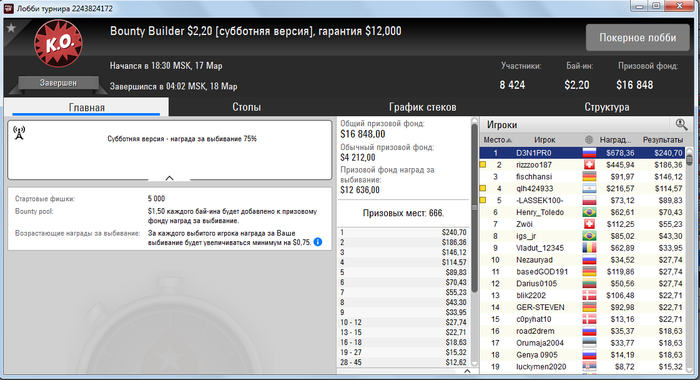 Через 2 года, в ноябре 2017 я смотрел ютюбчик и наткнулся на нарезки "Топ 5 хиро коллов " и " Топ 5 блефов", что то внутри меня снова зажглось и я опять скачал клиент игры. Залил 100$ и конечно играл не по БР, и когда почти все проиграл , попал на финалку Баунти Билдера за 11$ став 9м получил 300$ . Конечно почувствовал себя Богом покера я сразу полез в Баунти билдер $82 , где мне сразу всё объяснили и я вылетел без единого нокаута. После я начал читать книжки по покеру и смотреть разборы рук в интернете. И вот в конце января я выиграл свой первый турнир Bounty Builder $5.50 [Saturday Special], $7.5K Gtd и 806$. вывел 600$ чтоб успокоить родителей ( которые очень переживали что я их проиграю).