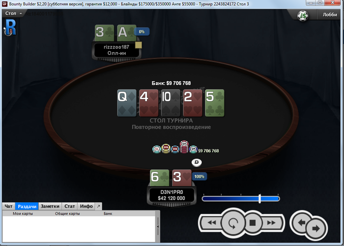 с оставшихся 200$ я всячески пытался раскрутиться , но турнирчики не заходили. Начал искать варианты и когда осталось 15$ полез в кэш 0.05/0.10с и за 3 дня дошел до 70$ , и за пол часа вернулся опять к 15$(проиграв 18$ старшим фулхаусом JJJ33 карэ 3333 , конечно же 3ка на ривере, и еще 2 бэд бита). Вообщем сгорев окончательно я загрузил баунти билдеры за 11$ и 2,2$ и выбив кого то , загрузил биг за 3.5$. И решил что если проиграю все то беру паузу. К счастью я выиграл баунти за 2.2$ и 919$.
