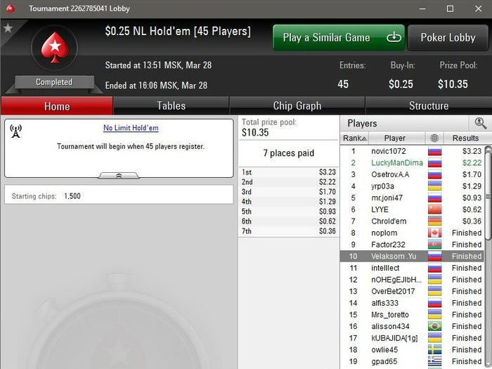 Глава первая жизнь на микролимите😯 Сегодня начал осуществлять свою цель! Цель №1 поднять банк до 500$. Банк 8$. На сегодняшний день я сыграл 6 SnG турниров 0.25$ Мой результат из 6 турниров, я занял в одном 🥇 и в другом 🥈 место. Фото отчёт прилагается📌 Подсчёт дохода Потратил 1,5$ на Бай-Ин Выиграл 5,45$ Доход 3,95$ Мой банк вырос до 11,95$