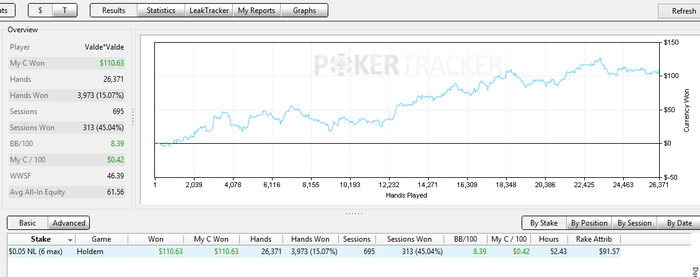 Есть постоянная работа , так что покеру уделяю не так много времени как бы хотелось, играю преимущественно в будние дни с 12.00 до 17.00 и ночью с 24.00 до 2.00 . В среднем с таким графиком 30-40к получается откатать