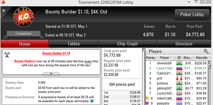 Привет всем! Буду выкладывать результаты сессий . Планирую отыгрывать по 1000Снг по 4.5 на PS .Паралельно буду играть несколько МТТ пару билдеров за 4.4 и 7.5 один биг за 1.1 и марафон за 5.5 . Тему создаю для самодисциплины и конечно же общения .. начинаю с 12.04.2017