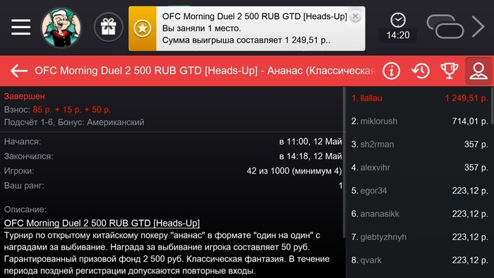 Всем привет!!! Меня зовут Александр, играю в покер давно, но преимущественно как рекреационный игрок, начинал с холдема, но с появлением Ананаса с головой ушёл в него, и не отпускает уже последний год так точно, часто забрасывал из-за хорошенького тильта и слива очередного депа, сейчас же решил взяться за голову, поставить цель и достигать её. Раньше никогда не вёл дневники, решил создать с целью самоконтроля ну и пообщаться со знакомыми уже на столах вышеупомянутого Pokerdom игроками. Играть постоянно сессиями не сильно получается, поэтому часто захожу с телефона сыграть несколько раздач в кеш, либо sit-n-go по китайскому, вечером же могу загрузить турнир и параллельно играть хедсапы или кеш) Надеюсь, акулы китайского помогут с составлением статистики в exel. Пока по планам ничего грандиозного нет, наращиваю банкролл, начал путь с выигранных в розыгрыше 200тд, хочу выйти на лимит 5-10р, стабильно играть турниры, в том числе и регулярные серии mcoop u gcoop.