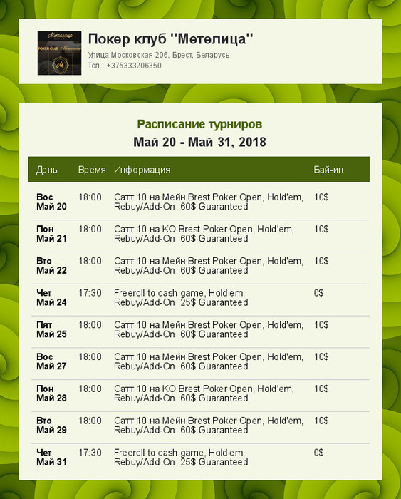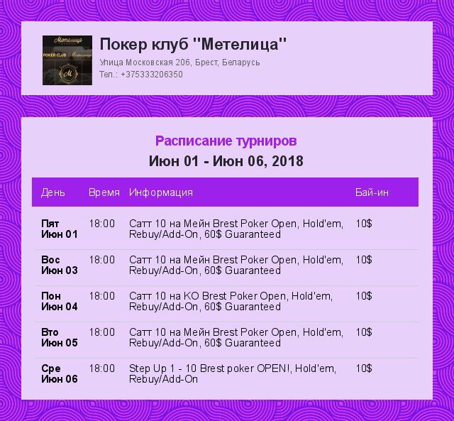 Друзья, в первой половине июня мы приглашаем вас в уже полюбившийся многим город Брест! На этот раз мы проведём Brest Poker Open, в котором мы постарались учесть ваши пожелания и разнообразили расписание турниров! С 7-го по 12-го июня "Metelica poker club" совмесно с казино Метелица (http://casino-metelica.by/%D0%BF%D0%BE%D0%BA%D0%B5%D1%80-%D0%BA%D0%BB%D1%83%D0%B1/) проведёт шестидневную серию турниров.