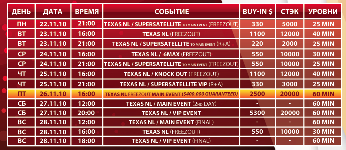Расписание турниров, а также стоимость путевки и перечень специальных бонусов при ее приобретении Poker Club Management опубликует в ближайшие дни.