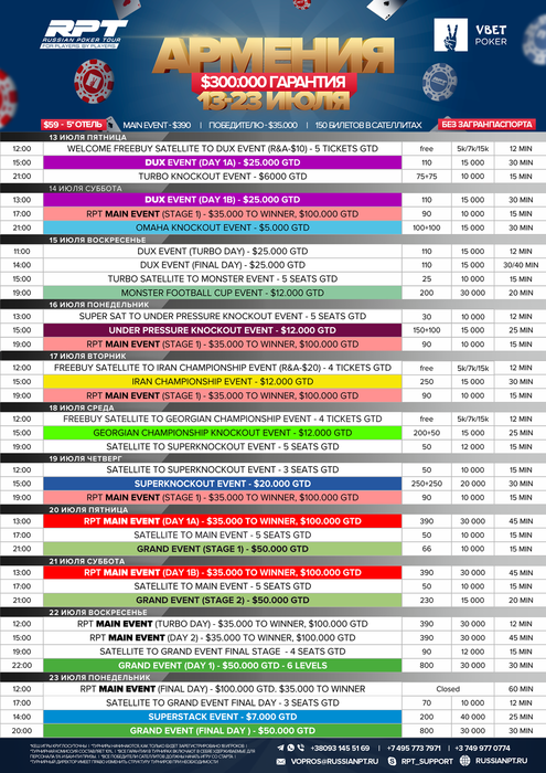 О ТУРНИРАХ И ПРИЗОВЫХ Июльское расписание RPT выделяется большим количеством доступных турниров, это сделано для привлечения еще большего числа локальных участников. Главный турнир серии пройдет с байином в $390, вместе с тем в расписании есть много новинок. Grand Event - с байином в $800 и двумя входными фазами, SuperKnockout Event - с байином в $500, и большое количество более доступных турниров с байинами до $400. Отличительная особенность этапа в Армении, с призовых не удерживаются налоги, как на минских этапах.