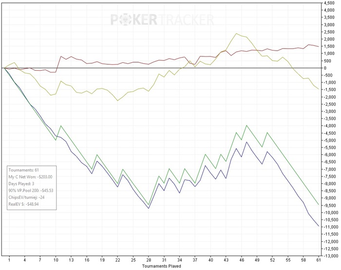 Лимит 15$. Как видно фиолетовая полоса (ев бабло) резко улетела вниз, за чуть больше сотню турниров сегодня слил 225ев$, это пока худший день в спинах.