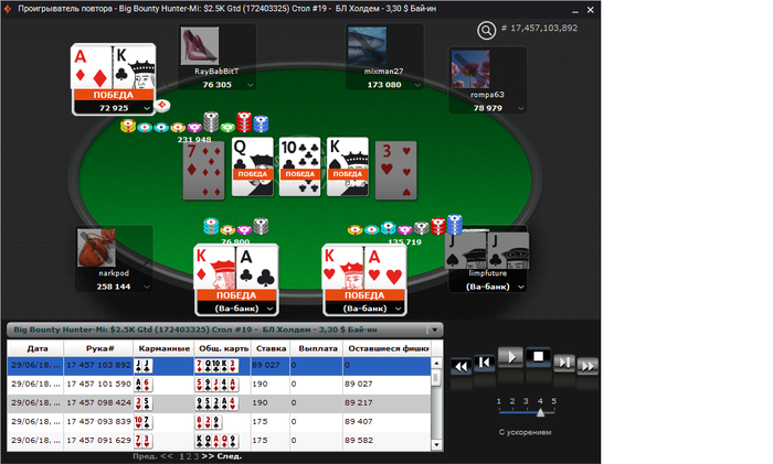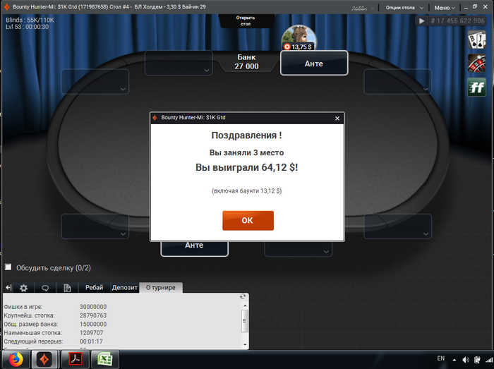 За 4 часа закончил катку.13 туров, в топ10 за 2.2$ SBvsBB сделал тактический лимп с в надежде на пуш(стеки 30бб, лимпы с СБ ББ обычно воспринимают как личное оскорбление), получил его и был наказан за хитрожопость фартожопостью и. Решил быть умнее, чем обычно и зафиксировать минус.БР - 53$