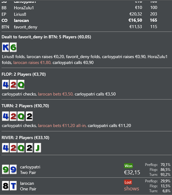 Ничего особенного. Стандартные действия в 4бетпоте Игрок на баттоне 3бетнул, бб колдколл 3бета, я 4бет, оба колл. Флоп- тройной чек. Терн, баттон ставит доборные 20%, все колл. На ривере баттон ставит второй баррель в 20%, бб колл.