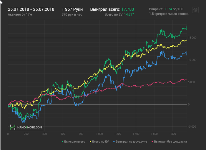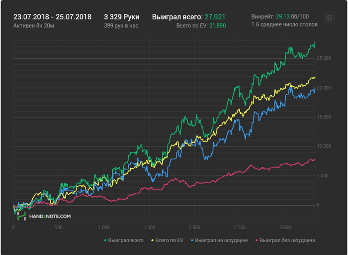 1. Спины - самая дисперсионная дисциплина. Будет гореть, будет полыхать, будет бомбить от несправедливости. Но ты сам выбрал путь боли 2. Ввиду пункта выше, 154 турнира - это пшик. Даже тысяча - это не особая дистанция для спинов (но хоть какая-то). Хочешь репрезентативную картину - 3000+. 3. Забудь про зелёную линию и формальный ITM. Спины - это всё про мат.ожидание. Его, конечно, на хлеб не намажешь, но только оно показывает хоть как-то твой навык в игре. 4. Предыдущий пункт и потенциальное продвижение по лимитам выше подсказывают, что рано или поздно нужно будет побороть интроверсию. Даже если опустить вопрос обучения, за месяц можно на изи потерять 100+ БИ с положительным МО - поэтому сейчас так популярны услуги страхования EV-профита (в пулах или отдельной услугой). Разумеется, так как это означает двустороннее финансовое обязательство, без документов тебя никуда не примут. Но, если ты не будешь как мудак креативно относиться ко взятым на себя обязательствам, в арбитраж попасть будет не так легко. Собственно, 80-90% покеристов играют себе, поднимаются по лимитам и бед не знают, но всегда найдётся горстка людей, которые верят в безнаказанность интернетов и то, что "покир это свобода". Для таких товарищей и существует арбитраж (а в ИРЛ - места, не столь отдалённые). 5. Без страхования EV планируй банкролл примерно в размере 300 БИ. Со страхованием месяц можно более-менее вытянуть и с сотней (если играешь в + по EV), но лучше 150-200.