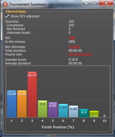 Сегодня сыграно: 104 SnG Turbo 0,5$ EVRoi 10% Roi -9% БР: 26,73$