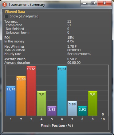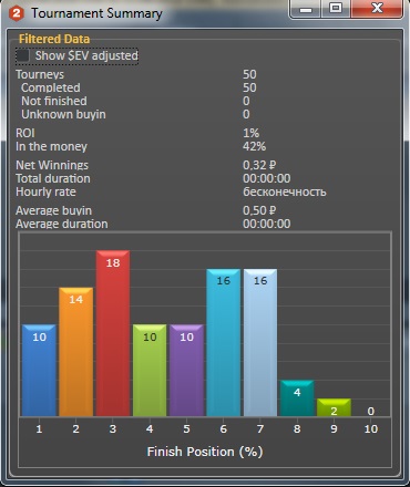 Сегодня сыграно: 50 SnG Turbo 0,5$ EVRoi 17% Roi 1% БР: 30,83$