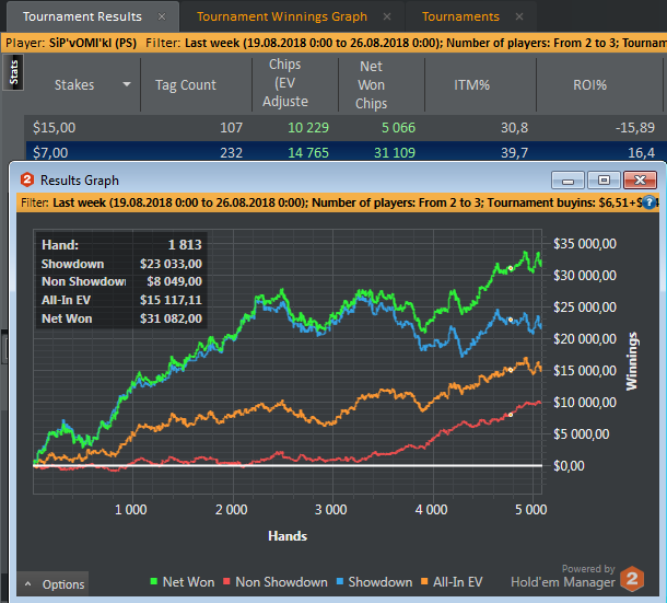 На данный момент играю два смежных лимита (7-15) с переменным успехом. Бр 800б. Играть планирую вторник-суббота, понедельник - по желанию, воскресенье буду пробовать выстрелить на мттшках. Из софта - хм2, соответственно и графики будут оттуда. Отчитываться буду раз в неделю в понедельник (если конечно не зальюсь к этому времени))). На этом пока все. Удачи мне.