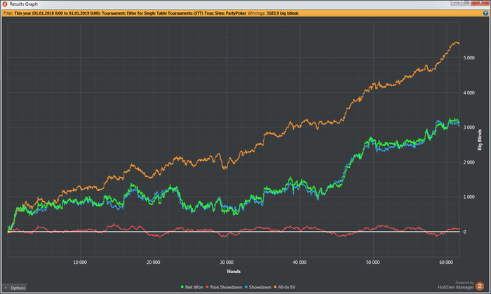 Но как вы уже понимаете, название дневника сказало все само за себя. На данный момент я играю SNG 9max))) 5-10-20$ на 888, и 5.5-11 на party. При этом словил довольно таки неплохой даунстрик на 130к рук на 888 и 60к рук на party. В дальнейших планах переход в МТТ, уже начал набираться знаний по этой дисциплине. Вдобавок уволился с основной работы прям перед этим даунстриком, день начала даунстрика и день увольнения - один день. Но уже натильтовался вдоволь, теперь планирую еще больше работать над игрой, развиваться, ведь мне очевидно есть куда расти даже в SNG. Хотя дисциплина является достаточно простой и многие сильные ребята из нее ушли уже давно в МТТ/спины. Т.к. потенциально $/hr в одностоловых SNG на данный момент далеко не самый высокий.