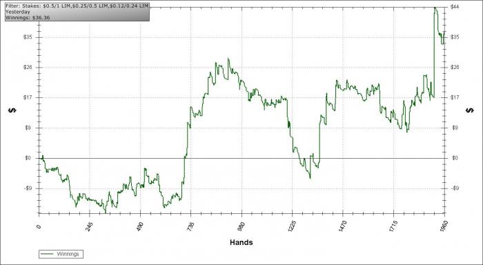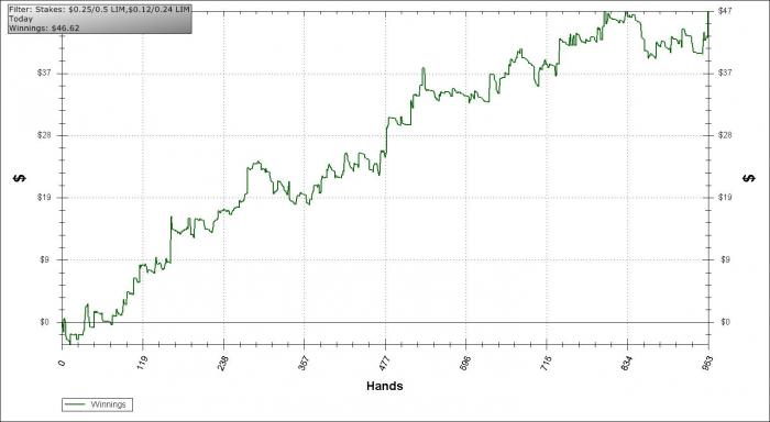 Блин, комп не пришел, т.к. в китае закрыли один из заводов hp. поставок hp нет, а моя контора сильно сидит на этом, а платить за отдельную поставку моего системника отказывается)= поэтому играю на стареньком жутко тормозящем буке)= Наконец-то поставил ХМ!!! Как я раньше с ПТ3 играл - ума не приложу. Поставил пока триальную на 2 недели. Теперь графики первый с того самого момента как я начал играть лимит холдем по сегодняшний день, т.е. с 8 ноября. Я не парился на длинных столах, а сразу пошел на короткие, думаю задепить на старсы и параллельно поиграть там. Второй - сегодняшняя сессия. Сегодняшней игрой доволен. Бывали, конечно спорные моменты: не добирал или же отдавал слишком много, но в целом - хорошо! Спасибо статьям с покерстратеджи. Играть получается мало, т.к. пытаюсь думать несколько глубже чем обычно, что сказывается на hands/hour и количестве столов - всего 6. Как набью руку - буду катать как обычно - 8. Теперь раздачки 1) Оппы - стандарт. ВВ - 62/4/1,8/42/44, Button 68/0/0,4/31/58 VPiP/PFR/Agg/WTS/W$SD. Ни за тем ни за другим исполнений замечено не было, разве что у бб на турне агрессия зашкаливает. В целом, очень приятные оппоненты. $0.25/$0.50 Limit Holdem 6 Players Hand Conversion Powered by weaktight.com Stacks: UTG dellboy690 ($3.44) UTG+1 champ_jack16 ($24.56) CO Hero ($24.24) BTN jefryjan ($13.90) SB tls1409 ($11.45) BB blingdog ($11.61)