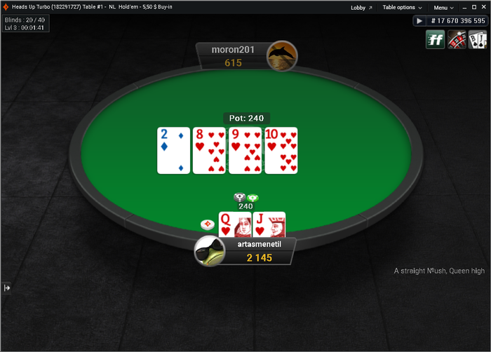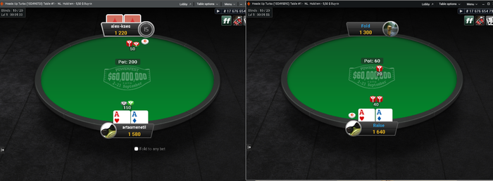Случилась как мне кажется интересная раздача. NL Texas Hold'em $11 USD Buy-in Trny: 182935915 Level: 2 Blinds(15/30) - Thursday, September 06, 13:41:28 EEST 2018 Table Heads Up Turbo (182935915) Table #1 (Real Money) Seat 2 is the button Total number of players : 2/2 Seat 2: HKaz1 ( 1,670 ) Seat 1: artasmenetil ( 1,330 ) Trny: 182935915 Level: 2 Blinds(15/30) HKaz1 posts small blind [15]. artasmenetil posts big blind [30]. ** Dealing down cards ** Dealt to artasmenetil [ Ad 9d ] HKaz1 raises [45] artasmenetil calls [30] ** Dealing Flop ** [ 8s, 2h, 4d ] artasmenetil checks HKaz1 bets [120] artasmenetil raises [288] HKaz1 calls [168] ** Dealing Turn ** [ Kh ] artasmenetil checks HKaz1 checks ** Dealing River ** [ 8d ] artasmenetil checks HKaz1 is all-In [1,322] artasmenetil is all-In [982] artasmenetil shows [ Ad, 9d ]a pair of Eights with Nine kicker. HKaz1 shows [ 6h, Ac ]a pair of Eights. HKaz1 wins 340 chips from the side pot 1 with a pair of Eights. artasmenetil wins 2,660 chips from the main pot with a pair