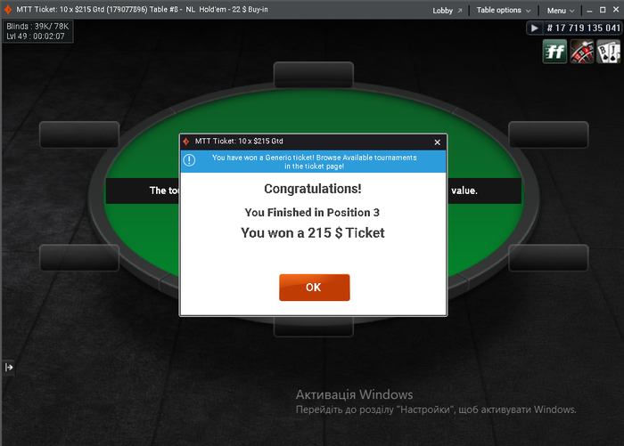 День 13 завершен. Сегодня сыграл пару ха . Сыграл в ноль. Запустил турниров. Попал на мини финалку вчерашнего турнира. Где занял 2 место. По иронии судьбы еще раз занял второе место. Играл хорошо но в конце игрок включил запрещенный прием. Начал ставить оллин все раздачи. И выиграл 2 выставления. Как по мне это хорошая тактика если с вами удача и вы точно понимаете что иначе проиграете . За все мои старания мне дали 166 $ тоже не плохо. Еще отобрался сегодня на турнир с 5 на 215 $ . Банкрол 1142$ +билет на 215$ Всем добра