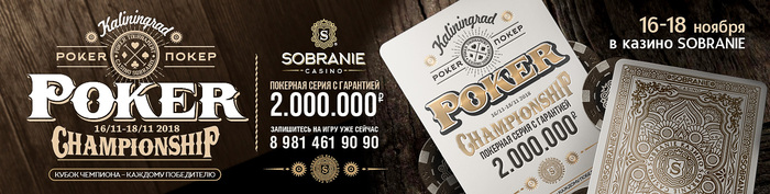 Дорогие друзья! Мы рады Вам сообщить, что с 16-18 ноября пройдёт уже 3й по счёту покерный чемпионат Калининградской области! На этот раз общая гарантия увеличена до 2 000 000 рублей. Ждём всех желающих в покерный клуб "SOBRANIE". Игорная зона "Янтарная" Калининградская область Звоните, запись уже открыта +7-981-461-90-90