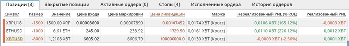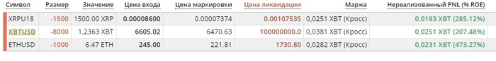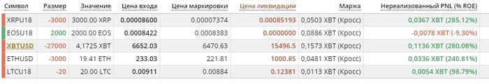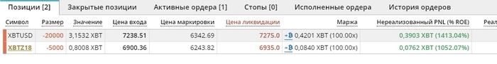 Вот например картинка с биржи с моими ставками. Рассскажу что значат цифры, т.к. буду публиковтаь скриншоты своих ставок и чтоб было понятно что к чему здесь. Первая графа символ XBTUSD XBTZ18 это все обозначение биткоина, на бирже мы торгуем не самим биткоином, а фьючерсом на него и это названия фьючерса. Далее сумма ставки, красная это на понижение, зеленая на рост, тут мы сделали 2 ставки в 20к и 5к долларов на падение. 3 тут все просто, таже сумма в биткоинах XBT, так у нас называется биткоин на этой бирже. Далее цена входа, по какой цене я открыл сделку, цена маркировки, это цена на текущий момент. Тоесть 20к доллроав на снижения я отрывал на цене 7238, потмо цена упала на 6342. Дальше цена ликвидации, при достижении этой цены, моя ставку ликвидирует и деньги уйдут в пользу самого молодого миллиардера Британии (глава битмекс). Маржа, не особо важно, тут сколько денег есть в ставке на данный момент, моя ставка + профит или минус профит. И последний самый приятный, это сколько мы заработали в биткоинах, сделав ставку на падение вначале сентября, через пару недель я прибавил к своему депо половинку биткоина.
