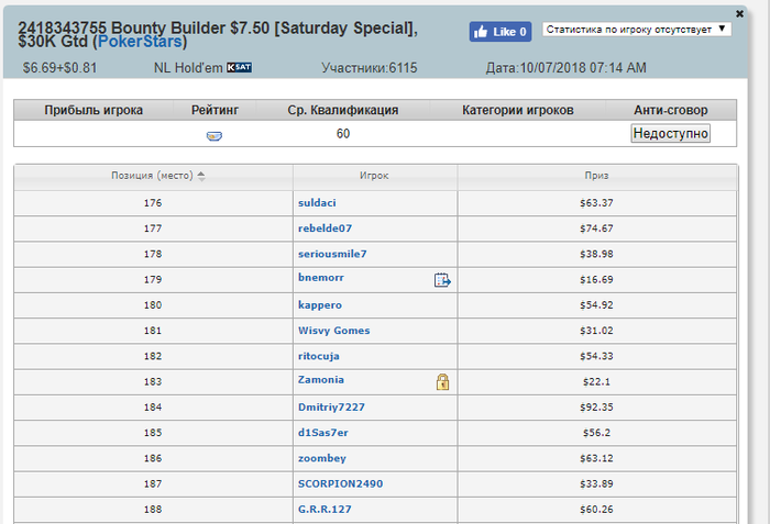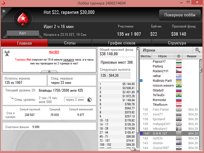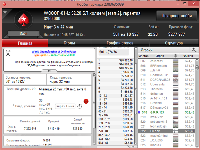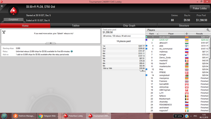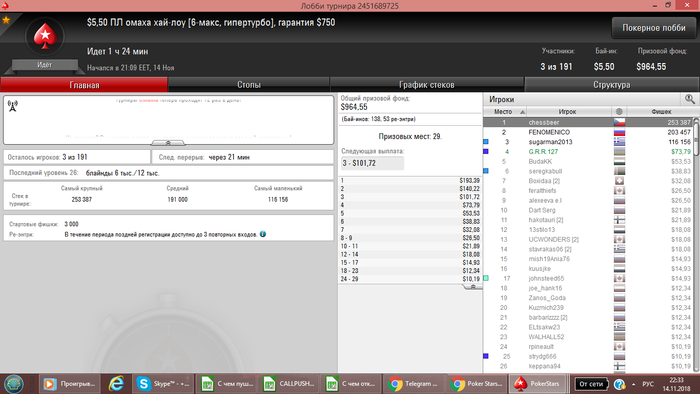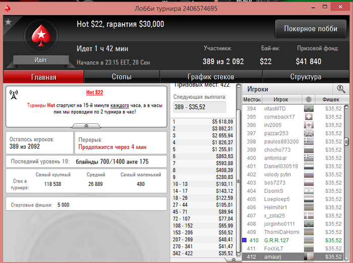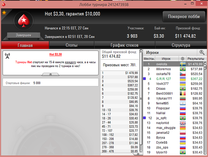 После того как перешли за 500$ начали играть и играю на данный момент 2.2-5.5 турниры Результаты не большие на данный момент - но они есть. Время просто не тратим! На данный момент это всё по результатам. Буду рад комментария, советам и общению.