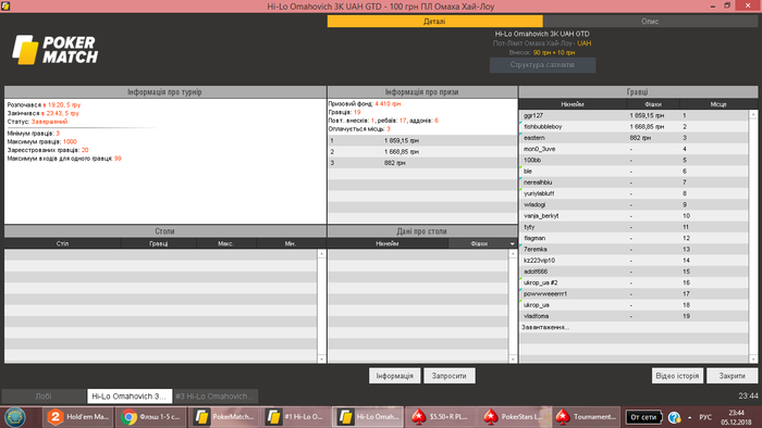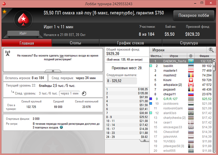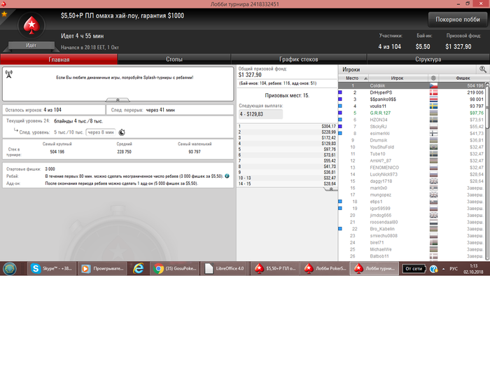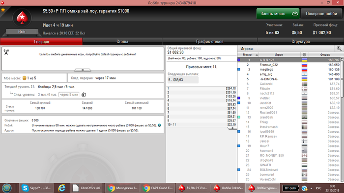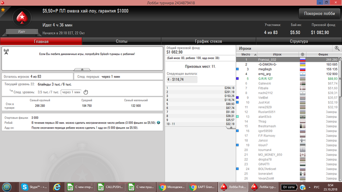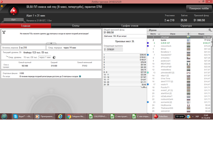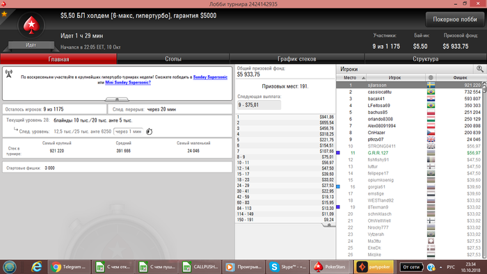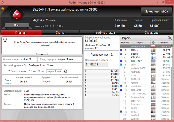 После прилёта с Сочи отдыхал, вчера сыграл всего 1 турнир. Так как время у нас перевели и не подстроился еще с графиком. Сегодня сел играть... очень не заходил... но в конце омаха (без ре-баев и ад-донов) смогла дать результат в + сессию сделать... Обидно 3й раз беру тут 5е место (сильный только 1 был оппонент, (чипак) ) остальные слабые, каким просто везло))) Результат и раздача на флопе выставились и 3 аута наловил за топ2 стек)
