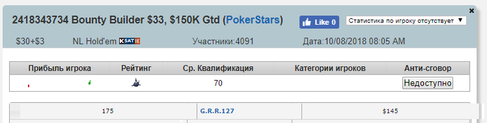 По результат скину то что есть за период месяца, дальше 1-2 раза в неделю или что-то с хорошим результатом. В принципе играю всё по БР 150-300 ББ, на хорошие турниры обтираюсь регулярно через сателлиты. И с помощью их смог поднять БР так как отбирался на турниры по дороже и брал там призовые +1 турнир по Бр сыграл хорошо но в топ4 не добрал сильно (хот3.3) но результат не плохой. Это на этапе 100-300$ результаты.