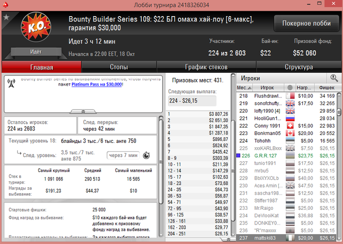 После неудачных сессий на выходных (были отборы на хот11, на мини-сандей 22) которые прошли без итм, начались трудовые будни играем те же турниры по 2.2-5.5 и отборки на турниры по дороже - начало недели порадовало результатом, не большие суммы но отбило сессии выходных и пошли немного в + БР 900+
