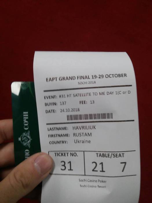 Прилетел вчера в Сочи. Чувствовал что в хорошей форме, не смотря на 3 перелёта. Решил сыграть турнир по 132$ сат на мейн 1к+, вместо след. дня, то есть уже сегодня. А сегодня по 92$ играть буду на мейн. Вчера дошли до призов и забрали сумму деньгами вместо билета (взяли 42000руб.)
