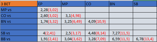 Посмотрел статы 3бетов по позициям топ регов лимита, практически у всех показатели выше нежели я для себя наметил. Но я намеренно буду занижать себе рейнджы, пока не буду себя чувствовать более уверенно в 3бет банках. Но в общем совершенно очевидно что хорошие игроки играют более агрессивно.