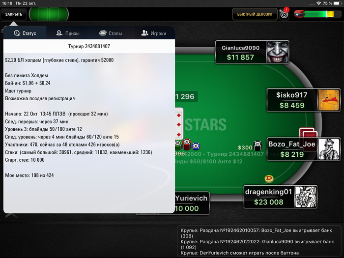 Всем Драсте. Меня зовут Денис, мне 24 года, с покером познакомился в 2009 году, играл с ребятами в ДОТУ в «Garena» там же наткнулся на покер и научился основам. Затем играл чаще в VK в World Poker Club. На деньги начал играть с 2017 года. Играю я только на PokerStars, играю MTT и SNG, мой ник DenYurievich, играю не очень хорошо, пытаюсь развиваться, благодаря стримам, обучающим материалам. Мой самый крупный занос 338$ занял 1 место в турнире за 2.20$ 6max Hyper-Turbo. Моя слабость это вывод кэша после заноса, поэтому мой бр сейчас 60$. Сейчас решил наращивать БР, буду все новости выкладывать сюда. Буду очень рад вашей критике. Сейчас в планах купить ноут чтобы стримить. А так у меня только планшет, играю с него.