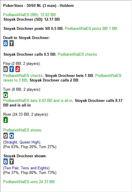 Когда я начал писать этот блог пару лет назад, понял через пару дней, что писать особо и нечего. Только около покерные темы. Лучше в дотку поиграю...ну если вы понимаете о чём я. А так хотя бы буду делать просчет в симпле, нажимать на кнопочки и тут со резюмировать раздачу. Чтобы она где то откладывалась, кроме как в небольших созданных нейронных связях мозга, которые я надеюсь хоть как то мне помогут в критической ситуации во время игры.