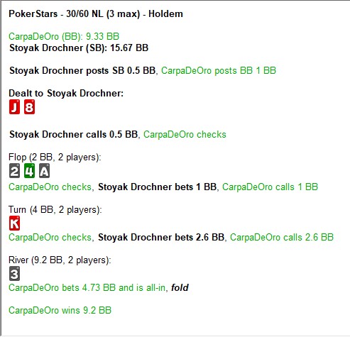 Разбирали двух игроков: не буду сейчас расписывать какие. Как и у всех в начале от ГТО модели большие расхождения. И всё же одну вещь я постоянно замечаю не только у учеников, но и других оппонентов - это то, что играя с существенно небольшим стеком (в спинах 25ББ и ниже) игроки забывают про существование ставок в 25% (ну или 1ББ в 4.5 банка BU vs BB) и барелят как с блеф диапазоном, так и с велью 30%-50%. Тем самым лишая себя пространства для манёвра на последующих улицах после чек рейзов и прочих вещей. Так же я постоянно замечаю, что оппоненты, против которых я ставлю такие ставки 25% либо на флопе, либо доборная на ривере - считается каким то неуважением уже многие годы.