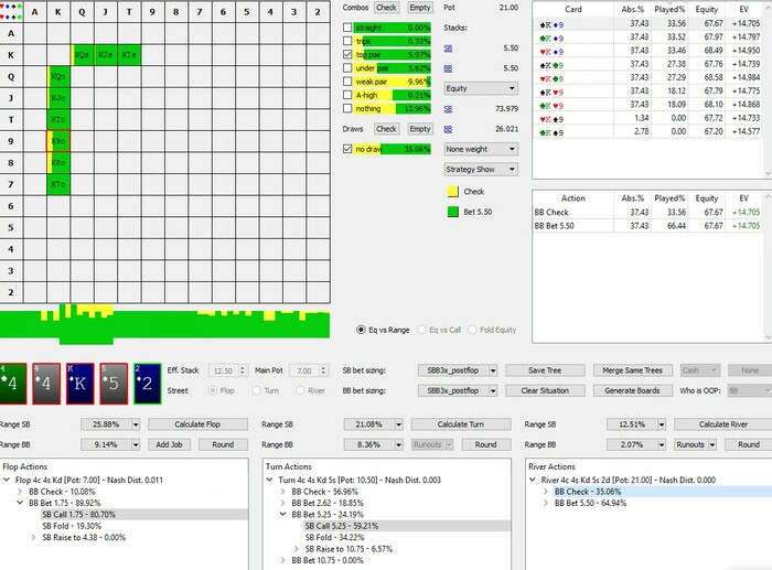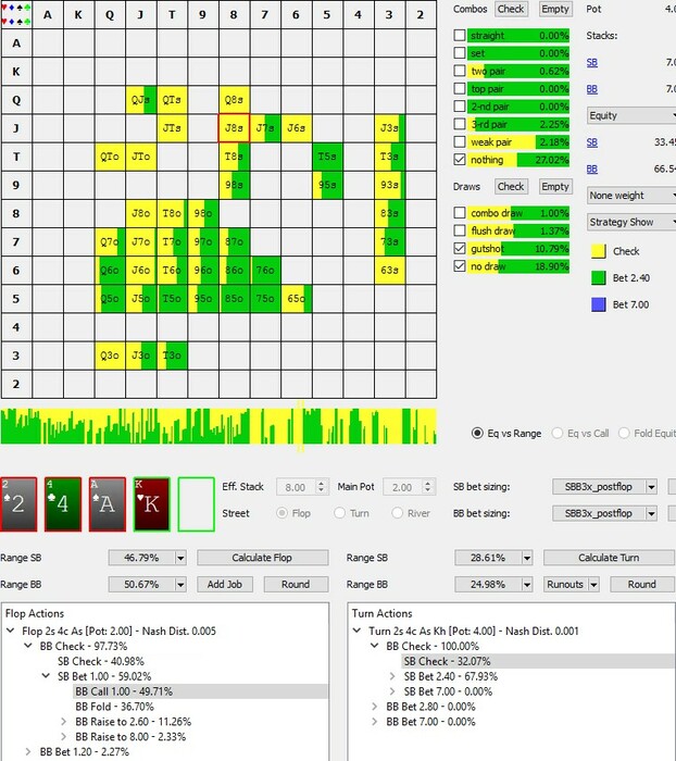 В данной ситуации во время игры возник вопрос: Что кроме двух топ пар и велью диапазона мы можем дальше разыгрывать агрессивно против агрессивного чек рейза оппонента. В данном случае солвер показывает 8,55%. Но думаю не сбалансированные реги будут с большей частотой чек-рейзить со своими гатшотами и OESD, и бекдорами без ШД велью.