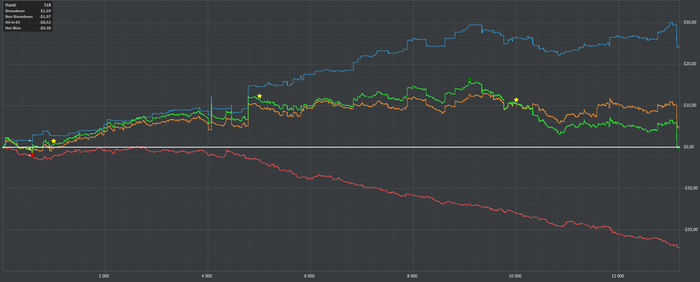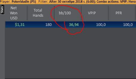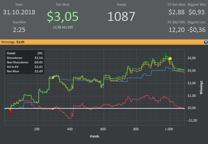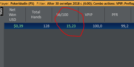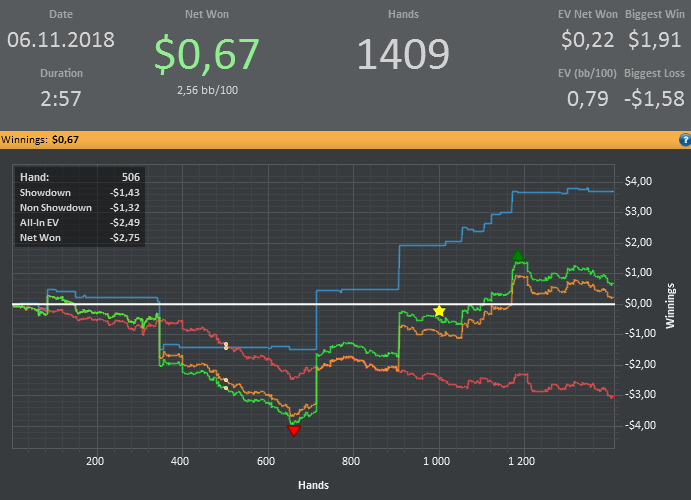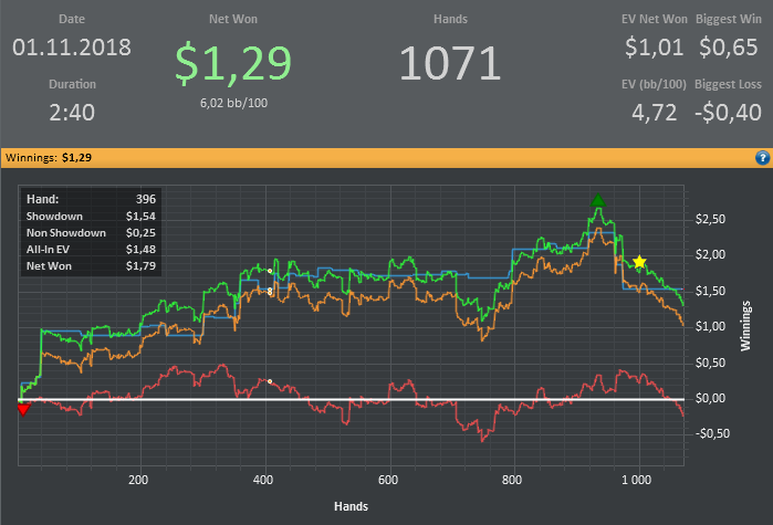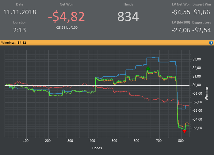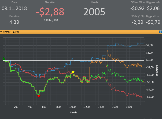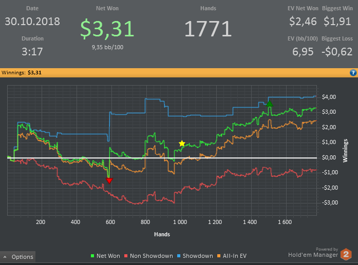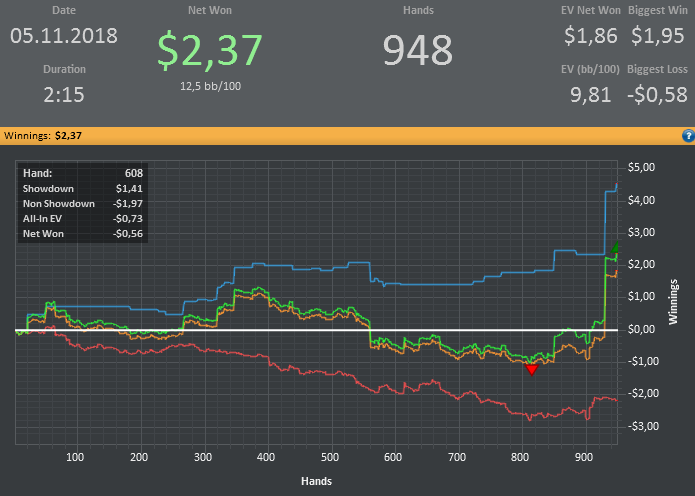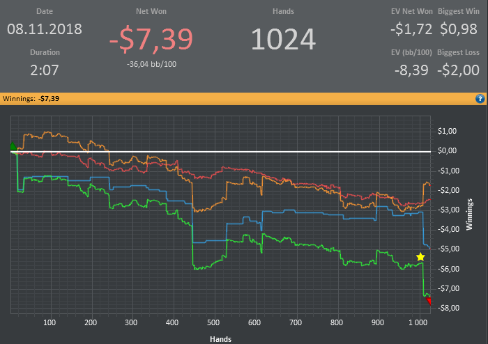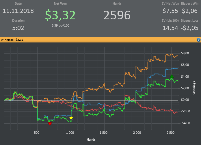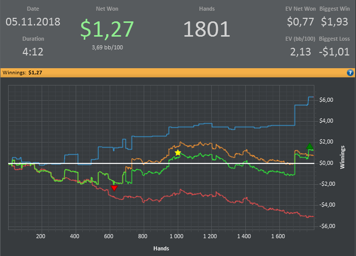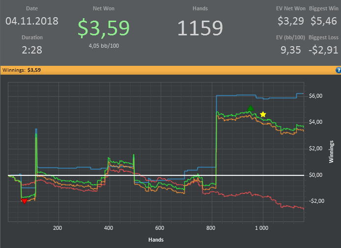 Хотя винрейт не очень, но все равно очень доволен данной сессией. Т.к. мог уйти в жесткий минус. (Воспитываю в себе дисциплину) Очень много раздач где на флопе была очень сильная рука, но приходилось выкидывать на ривере. Ну и соответственно поэтому красная пошла вниз.