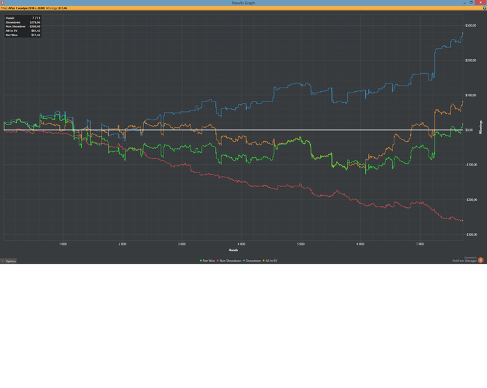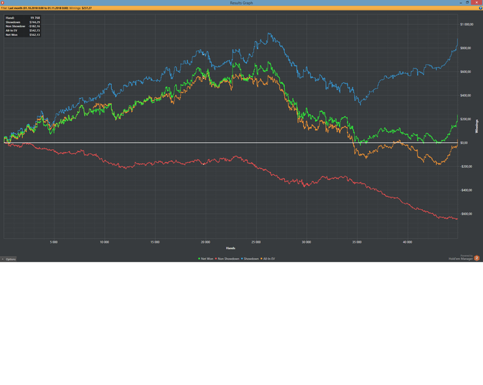 Здравствуйте, читатели Джипси, сижу на форуме около года, и наконец-то решился на довольно серьезный шаг - бросил работу и погрузился в покер! Вчера был мой последний рабочий день, и по этому поводу я решил завести блог, в основном для собственной мотивации и контроля! Играю в покер где-то с 2009, начинал со школьных нл10 рублей, потом фрироллы на пс и всевозможные бездепозитные бонусы. В январе этого года посмотрели с девушкой финал PCA 2019 и я загорелся зарабатывать покером. Все началось хорошо, я выиграл где-то 80 долларов на покердоме в турнире и еще столько же на их all-in shootout турнирах и пошел играть на пс, где с гордостью все и залил! После этого было несколько депозитов, и всегда мне казалось, что меня переезжают и дисперсия не на моей стороне. Но в сентябре я понял, что я просто обычный заливной телефон и решил изменить свой подход и стратегию! Играй нл25 зум на пс, к концу года хочу побить нл50 зум, в идеале нл100 зум! В середине месяца я поймал дикий даунстрик+пермотильт, в котором залил около 600-700 долларов, график не отражает игру с телефона на работе в агонии и желании отыграться! Но так как я уже твердо решил уйти из офиса, я пересмотрел свою психологическую составляющую игры и стал действовать адекватно и не тильтовать. В итоге мой профит за 3 недели сейчас составляет около 300 долларов. Буду выкладывать тут отчеты за сессии и свои мысли по некоторым раздачам. Во флопзилле и симпле не работаю, разбираю раздачи в хм2 и играю во многом, как чуйкорег. Всем удачи и любви! Мои цели на ноябрь: 150к раздач, 2 сессии по 3 часа в день!