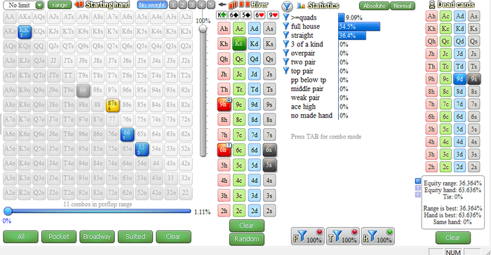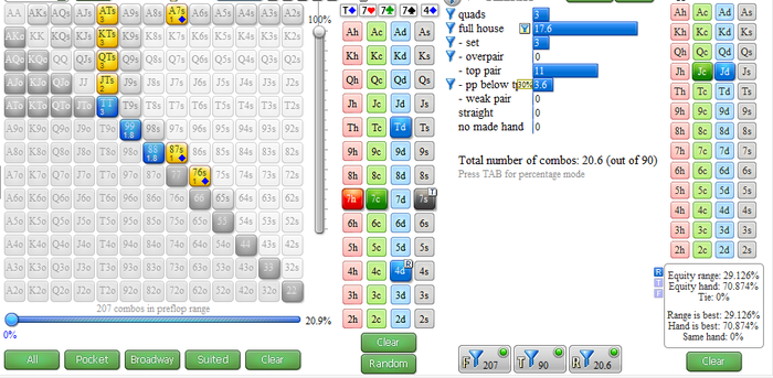 Выходит то что пуш здесь не очень выгоден? так как у нашей руки 39% эквити против его диапазона. Или я составил слишком тайтовый диапазон колла пуша оппом?