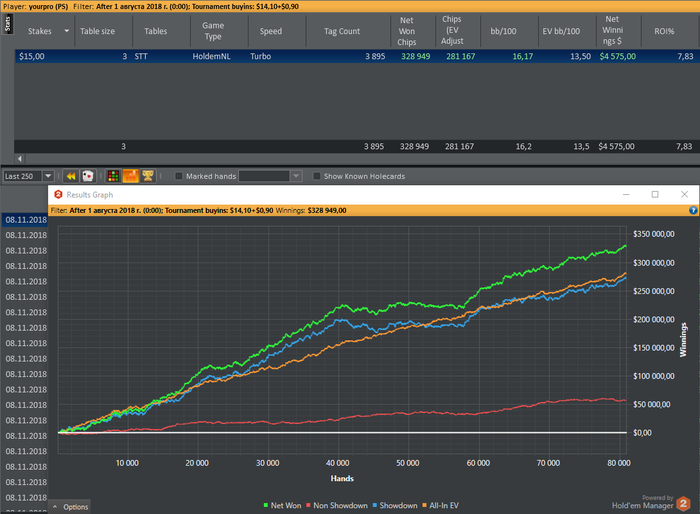 "yourpro". Покером я занимаюсь уже порядка 9 лет. Стартовал с SSS и CAP. В основном играл NL100-600, иногда выбирался за фишами и на NL1000-2000, затем перебрался в MSS и BSS на тех же лимитах. Теперь я снова вернулся к игре в коротких стеках на Spin&Go. Последние 1.5 года работал тренером по Spin&Go в покерной школе WinWin. В основном брал людей с 3 и 7 лимитов и доводил до уверенной игры на 15. После перерыва в последние пару месяцев (решение личных проблем + немного бил дистанцию, актуальный график прилагаю), рад сообщить, что этим и собираюсь продолжать заниматься, но уже на частной основе